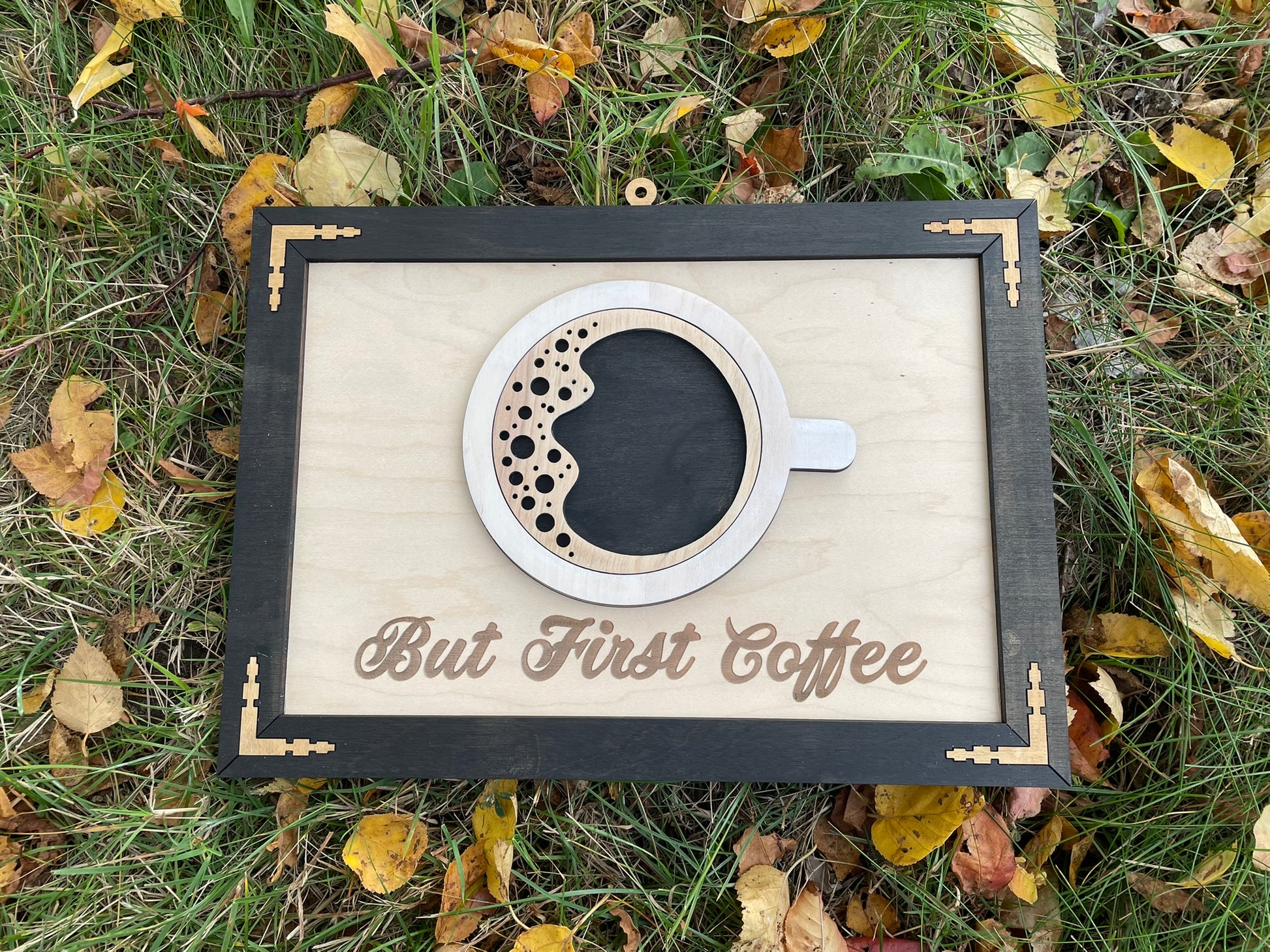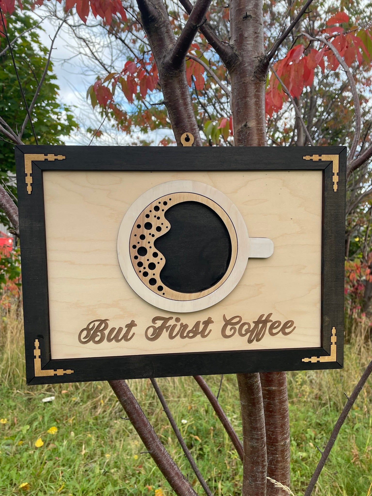 Elevate your space with this handcrafted "But First Coffee" wall sign, uniquely stained to enhance its natural texture. Measuring 14 by 10 inches, this elegant piece combines rustic charm with a refined aesthetic, perfect for coffee lovers who appreciate quality design. Created in 2025, it adds a timeless yet contemporary touch to any room, inviting a moment of calm and sophistication before starting the day.