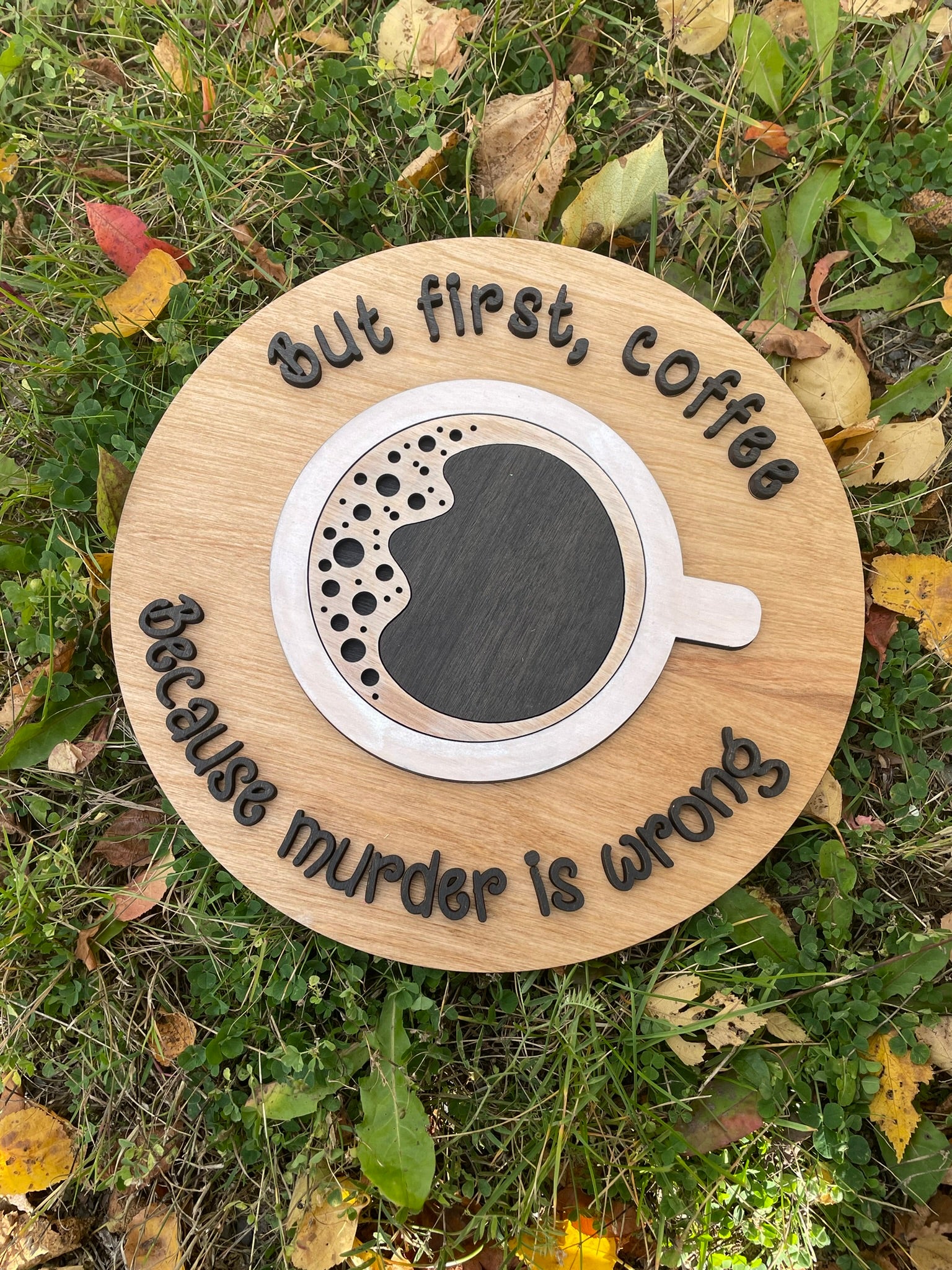 This elegant 11.5-inch handcrafted wall sign features the witty phrase “But First Coffee, Because Murder is Wrong,” expertly laser cut with refined detail.