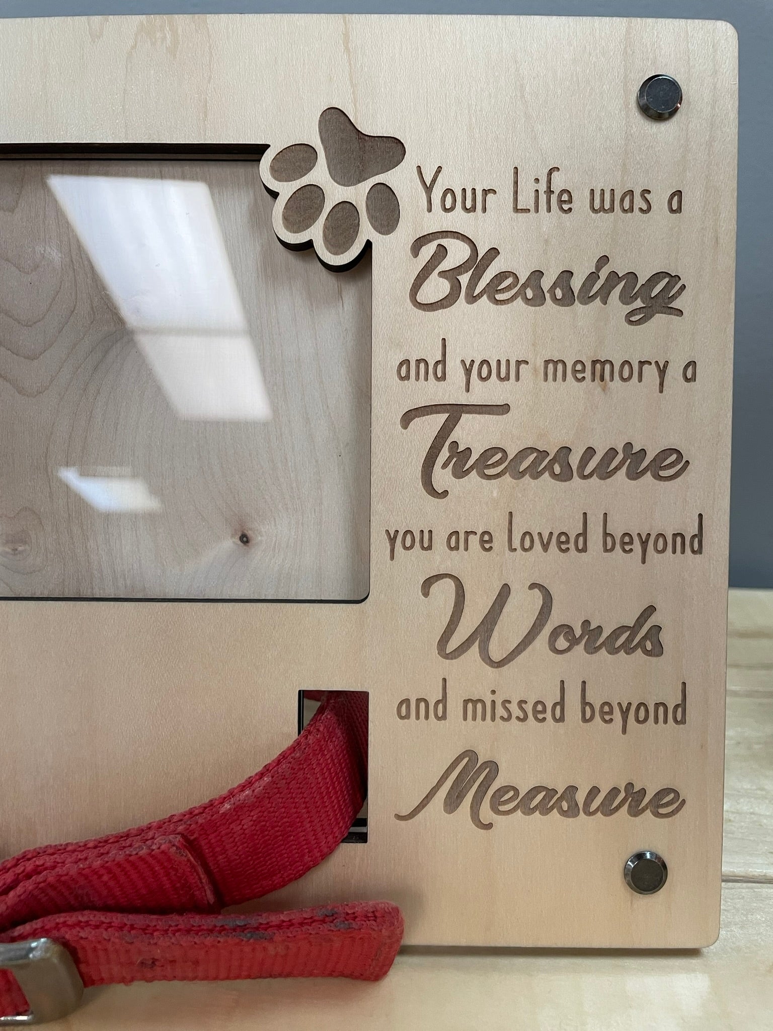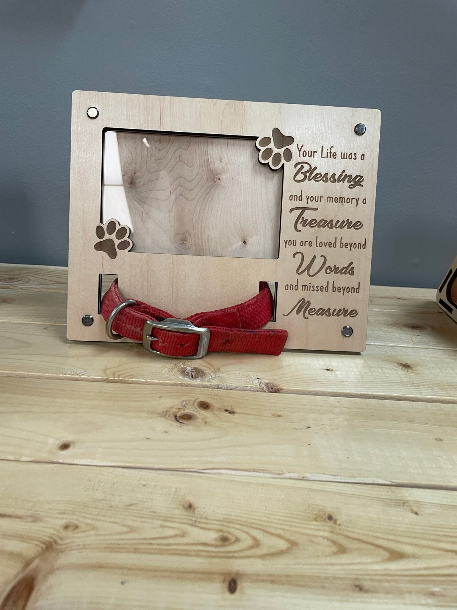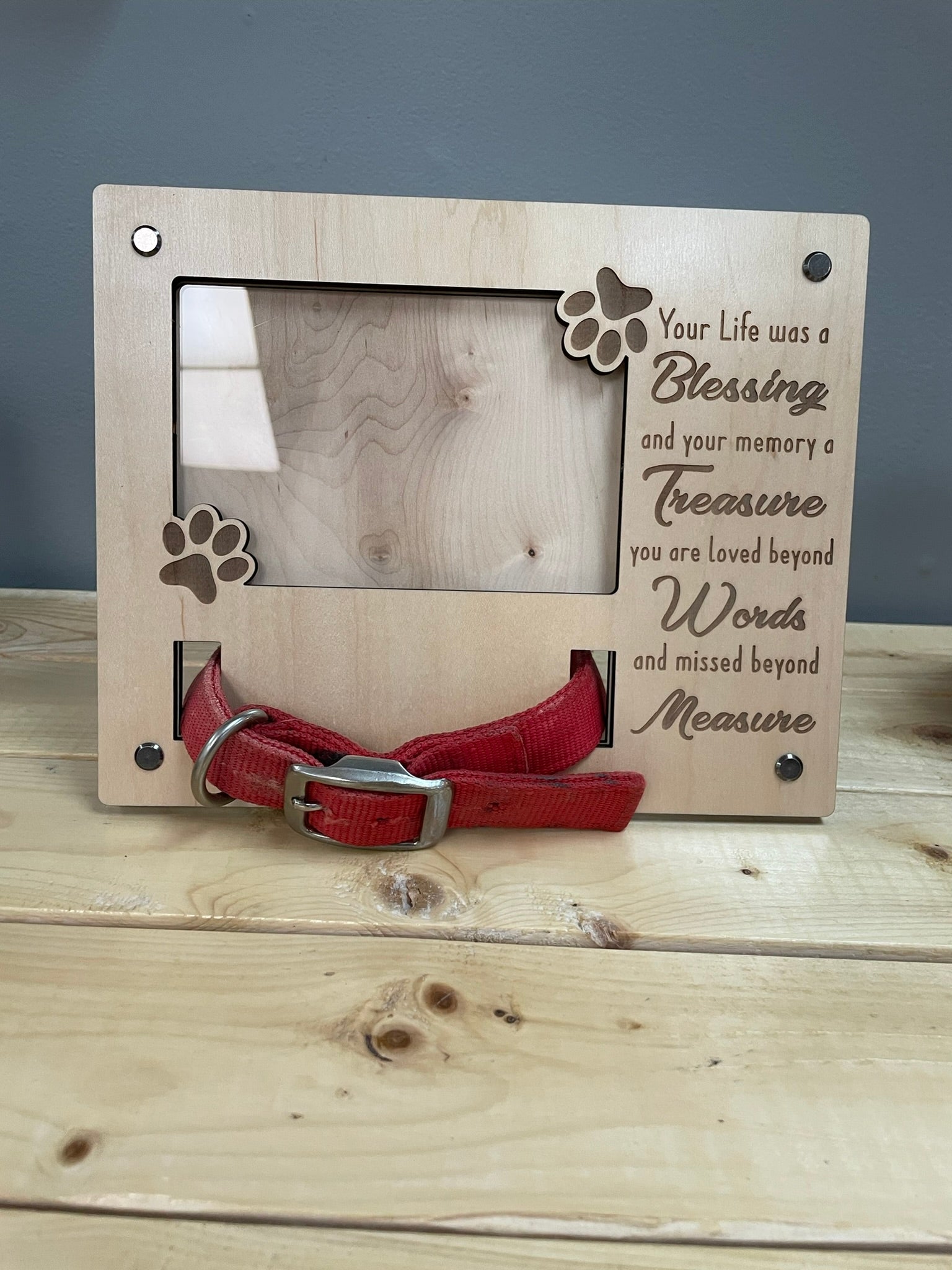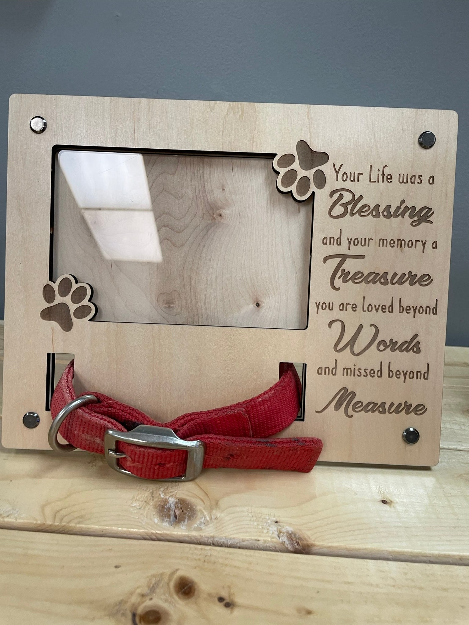 Immortalize your furry friend with our Dog Memorial Photo Frame. Crafted with premium maple plywood, this elegant 8x10 inch frame fits a 4x6 inch photo. Cherish your beloved pet forever in style.