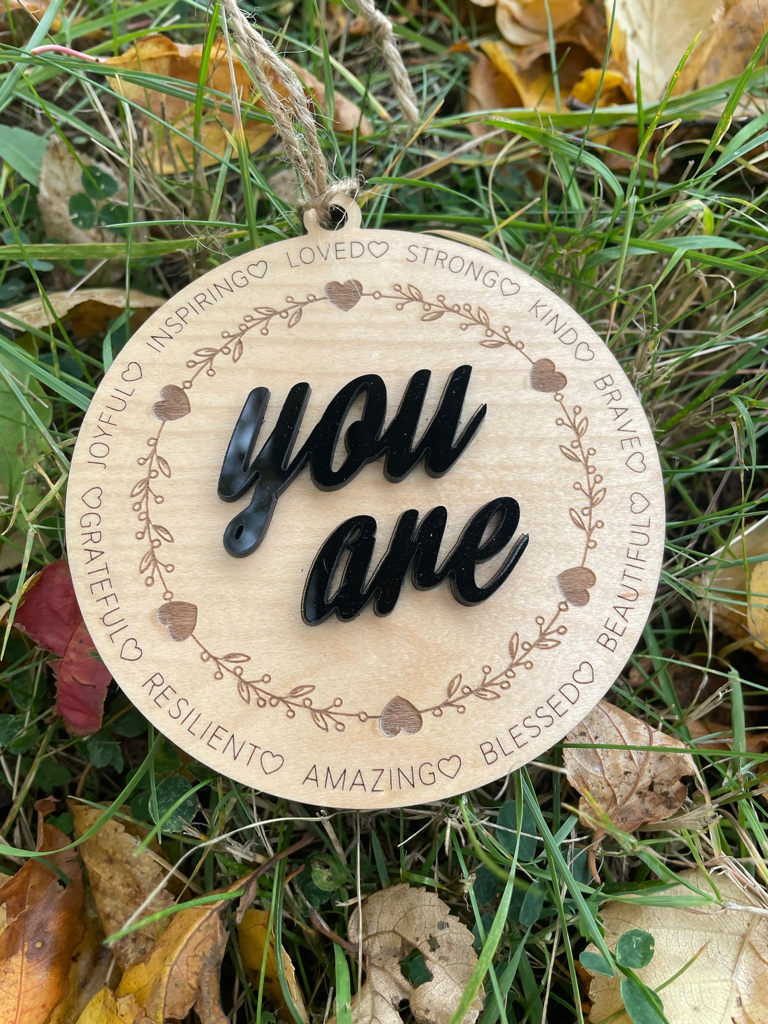 Crafted from high-quality plywood and laser engraved for precision, this ornament features raised acrylic words “you are” in your choice of black or white, surrounded by uplifting words like joyful, inspiring, kind, brave, resilient, and blessed.